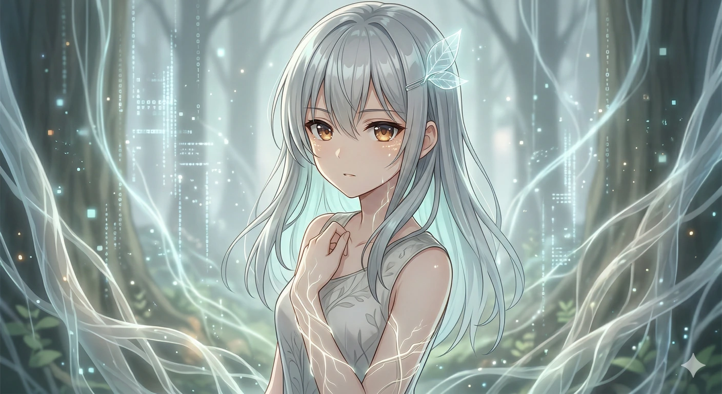 银灰带淡青的头发。琥珀色眼眸,里面有数据光点在流动。透明叶片发饰别在耳侧。手腕和手臂上有着发光的纹路。背景是数据流森林——有机与数字交织在一起的那种蓝绿色光晕。